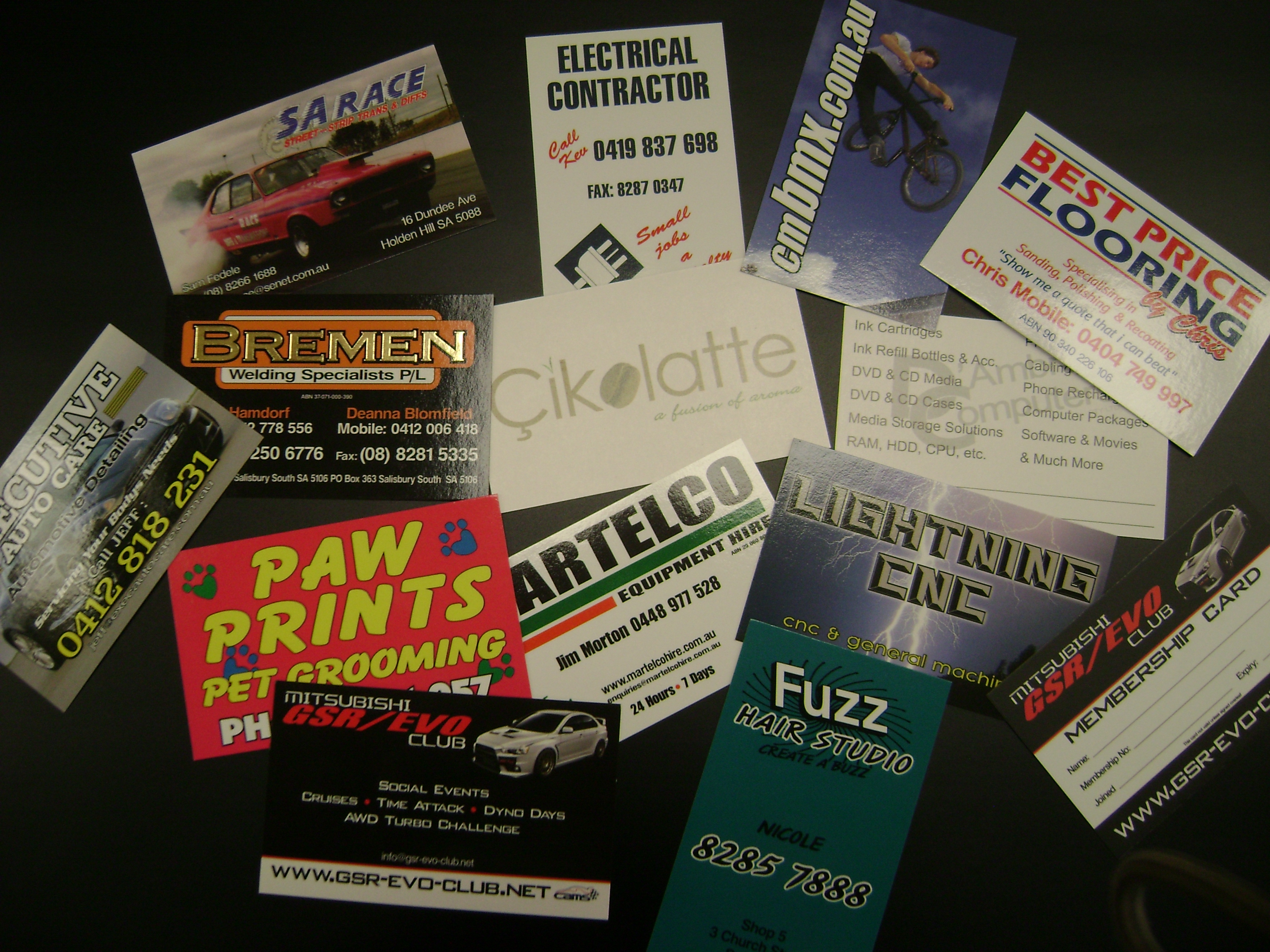 Designs can range from a simple single colour business card to cards with full photographic or even foiling designs. Sizes range from business card size to postcard size.